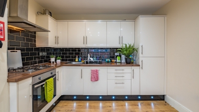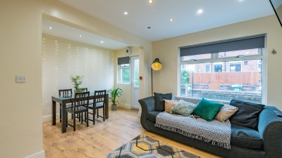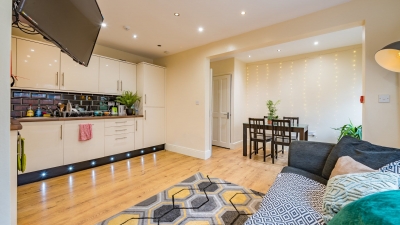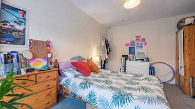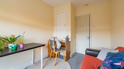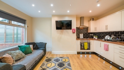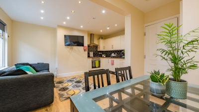 Inside, the property offers a bright and welcoming living room, ideal for relaxing or socialising with housemates, along with a modern, fully equipped kitchen featuring a washer-dryer and plenty of storage.